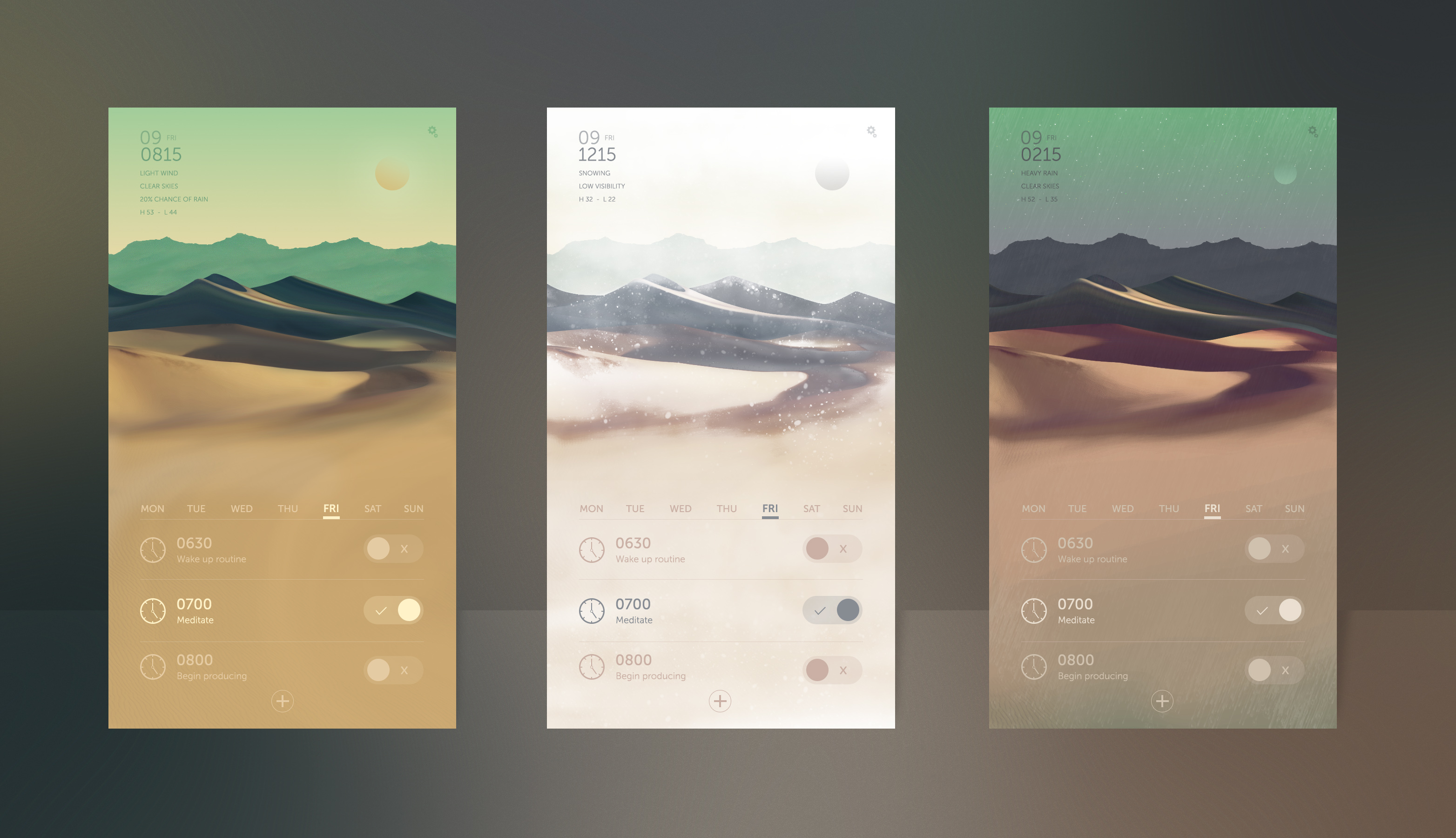 Alarm app featuring multi-variant weather and time animated backgrounds (2016)